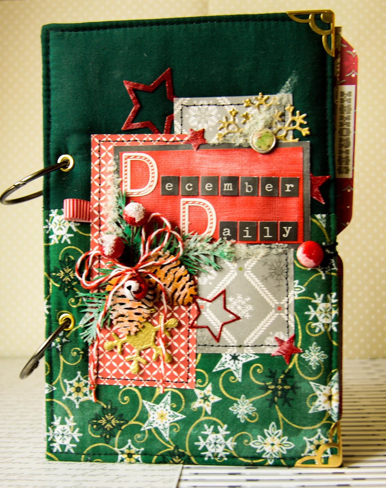 А обложку сделала тканевую, мягонькую и пеструю. Вообще, мне очень нравится сочетание темно-зеленого и темно-красного, такое классическое новогоднее сочетание. Звездочки и снежинки это вырубки покрытые пудрой для эмбоссинга. Веточка с шишечками покрашена жидким жемчугом и спреем, сверху все покрыла прозрачными каплями от фабрики декору северное сияние, с мерцающими блестками, очень нравится этот эффект, ну и все слегка "припорошила" прозрачным микробисером и белой акриловой краской. Вот не много деталей.